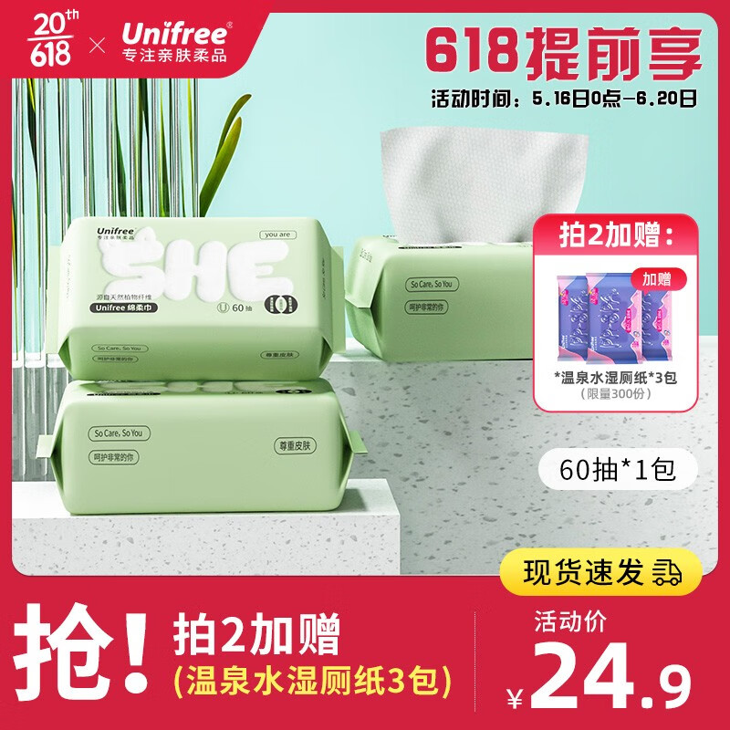 ¥19.9 unifree 珍珠纹一次性抽纸洗脸巾 20*20CM 加大加厚干湿两用 60抽*3包 珍珠纹洗脸巾60抽*3包 24.9