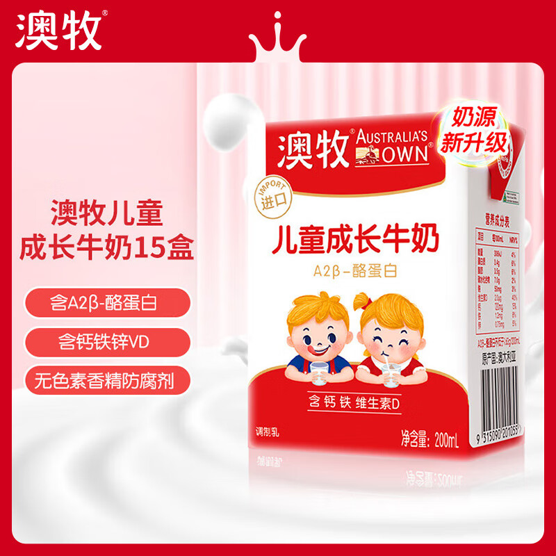 ¥123 澳牧(Australia's Own)儿童成长牛奶 A2-β酪蛋白铁锌VD全脂早餐奶200ml*15盒 128