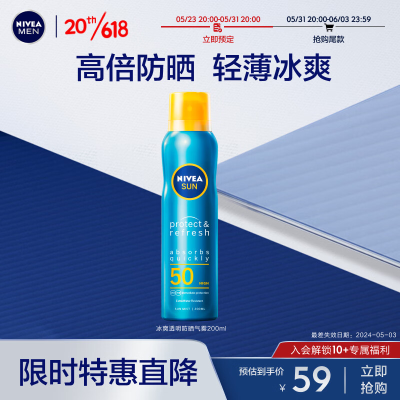¥35 妮维雅(NIVEA)防水防汗男女适用 冰爽透明防晒气雾200ml 户外SPF50 德国进口 59