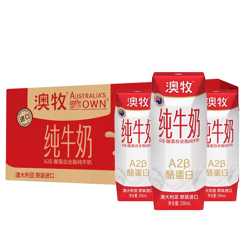 ¥208 澳牧(Australia's Own)高端全脂学生早餐奶 A2β-酪蛋白 高钙纯牛奶 250ml*24盒 248
