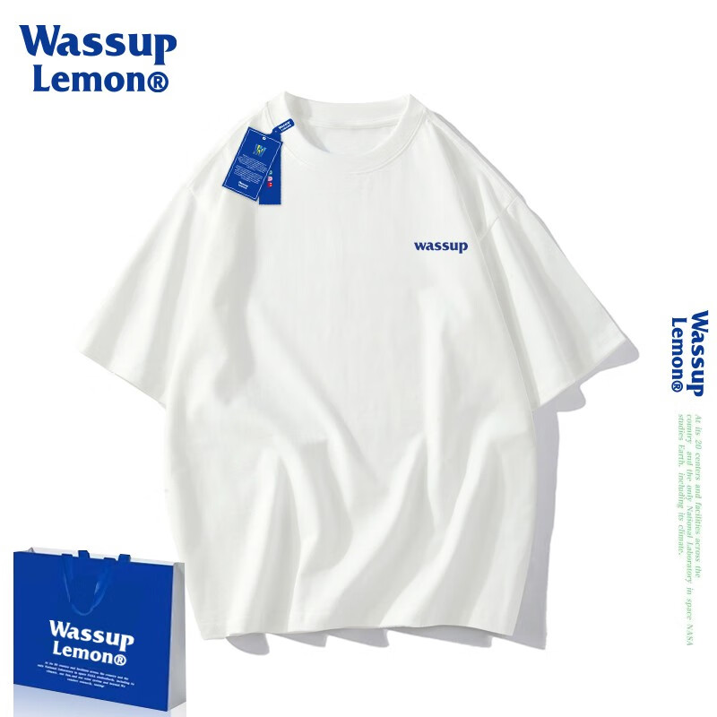 ¥19.9 WASSUP LEMON短袖t恤男纯棉2023新款wassup国潮落肩宽松情侣装简约印花上衣 白色3051 XL 150-170斤 29.9
