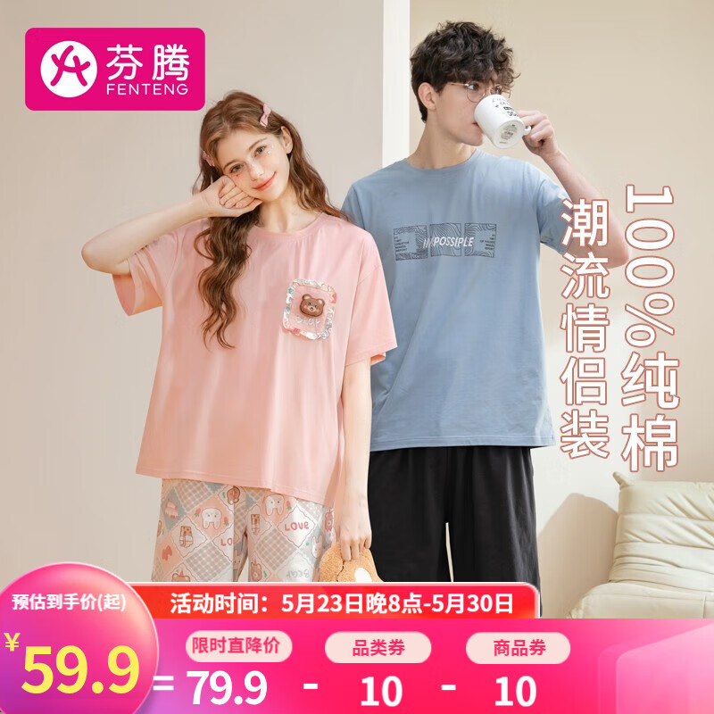 ¥69.9 芬腾 情侣短袖睡衣女纯棉2023年夏季新款休闲套头圆领男家居服套装 灰兰(男) XXXL 79.9