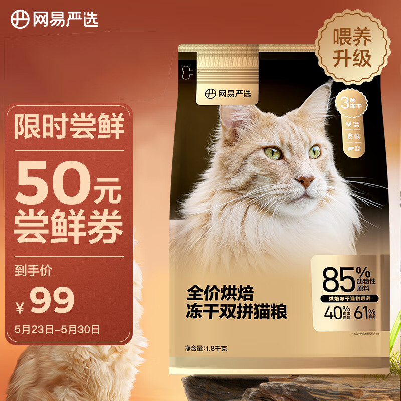 ¥99 网易严选低温烘焙成猫幼猫猫粮全价烘焙冻干双拼猫粮1.8kg 149