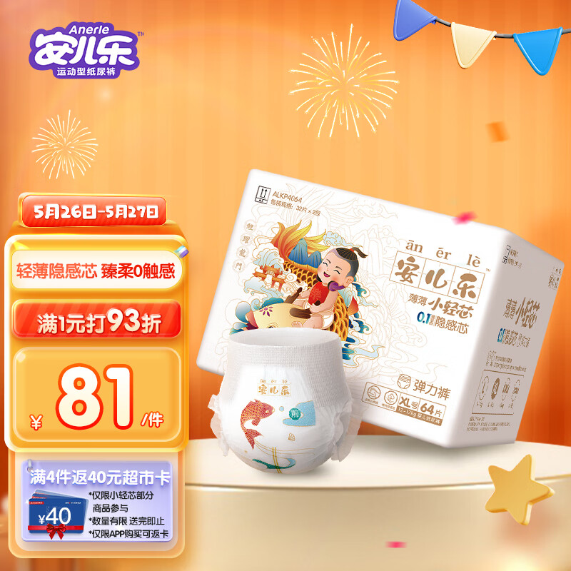 ¥95.93 安儿乐ANERLE小轻芯拉拉裤XL64片(12-17kg)婴儿超薄透气拉拉裤 96