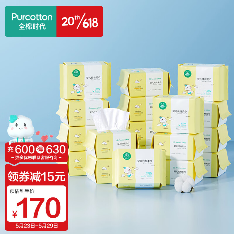 ¥179.7 全棉时代 棉柔巾婴儿棉柔巾100%纯棉洗脸巾一次性干湿两用 100抽*18包 194.7