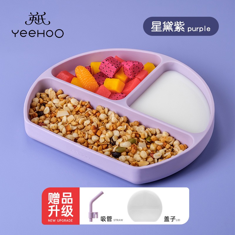 ¥39 英氏(YEEHOO)宝宝餐盘硅胶儿童学吃饭碗卡通可爱餐盘吸盘式婴幼儿用分格盘 三分格辅食盘(紫色) 89