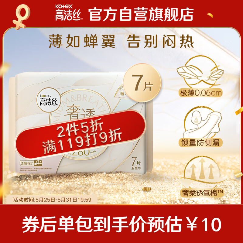 ¥22.9 高洁丝(Kotex)奢透蝉翼极薄棉柔卫生巾280mm7P薄如蝉翼 告别闷热 奢柔透气 24.9