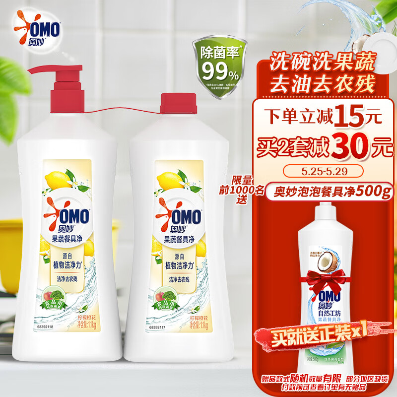 ¥46.1 奥妙果蔬餐具净洗洁精 柠檬橙花 洁净去农残 含替换装 1.1kg*2 49.9
