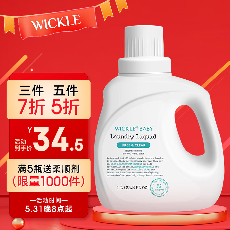 ¥68.05 WICKLE婴儿洗衣液新生婴儿宝宝专用酵素抑菌洗衣液 1000ml(自然香型) 69