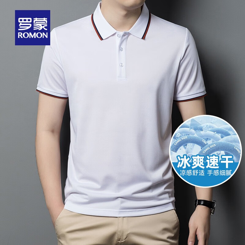 ¥53.9 罗蒙(ROMON)冰丝速干短袖t恤男夏季新款纯色polo中青年商务凉感翻领T恤 白色 170【建议124-136斤】 59.9
