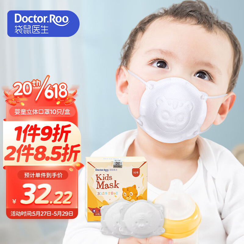 ¥36.95 袋鼠医生儿童口罩3d立体婴儿口罩0-6个月宝宝婴幼儿6-12个月小孩白色10支 37.9