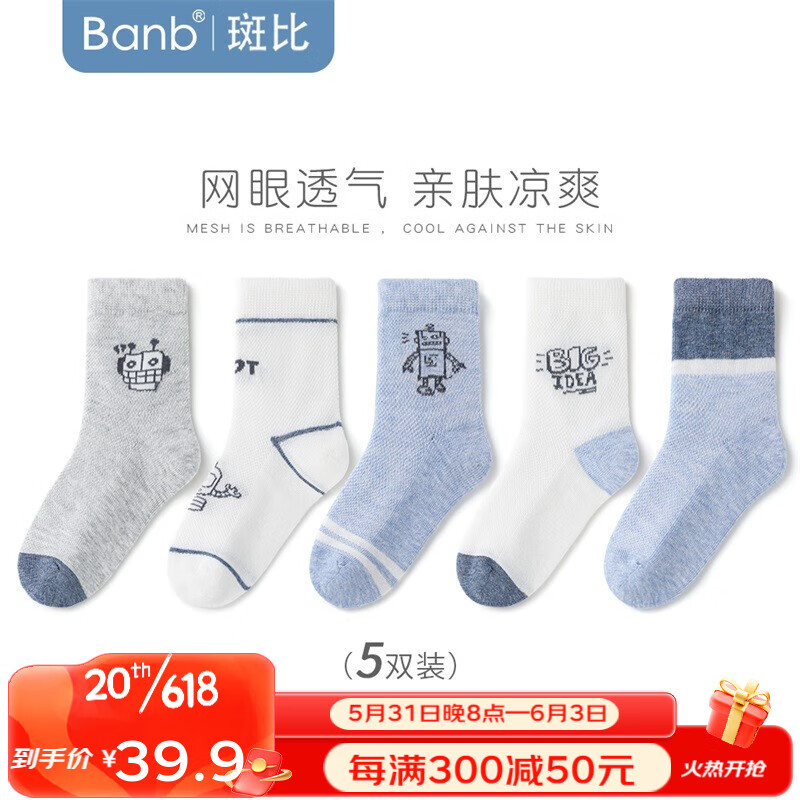 ¥31.9 斑比儿童袜子男春秋网眼薄款纯色精梳棉大童男女孩夏季天无骨中筒袜 BB22022男童薄款网眼袜5双装 22-24(建议11岁以上脚码38-42) 39.9