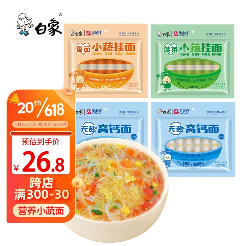 ¥23.9 白象 面条240g*4包菠菜面营养蔬菜面挂面细 小蔬2包,高钙2包 33.9
