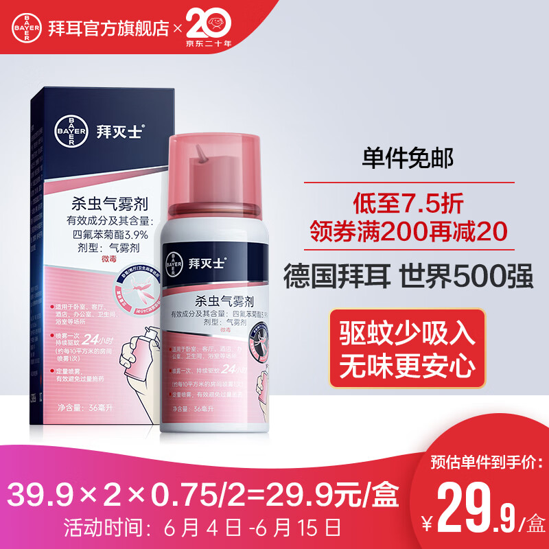 ¥19.9 拜耳(BAYER)德国拜耳 拜灭士定量灭蚊气雾剂喷雾杀虫蚊香液驱蚊神防蚊器 36ml单盒装 39.9