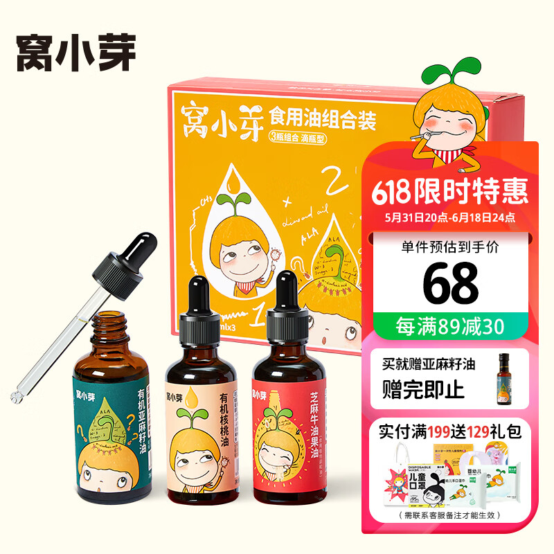 ¥97 窝小芽儿童有机核桃油礼盒凉拌热炒亚麻籽牛油果植物油(滴瓶)50ml*3/盒 98