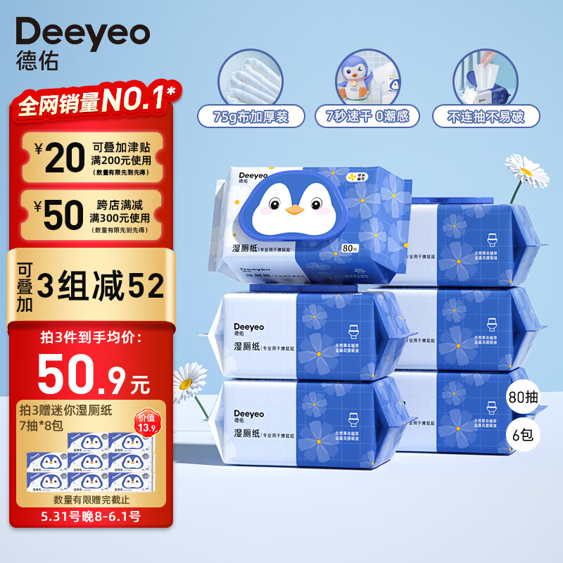 ¥54.9 德佑湿厕纸家庭装80抽*6包 洁厕湿纸巾厕纸湿巾 可搭配卷纸卫生纸使用 74.9