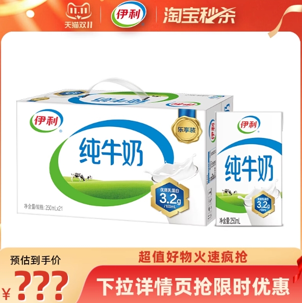 34.8元包邮!伊利纯牛奶250ml*21盒