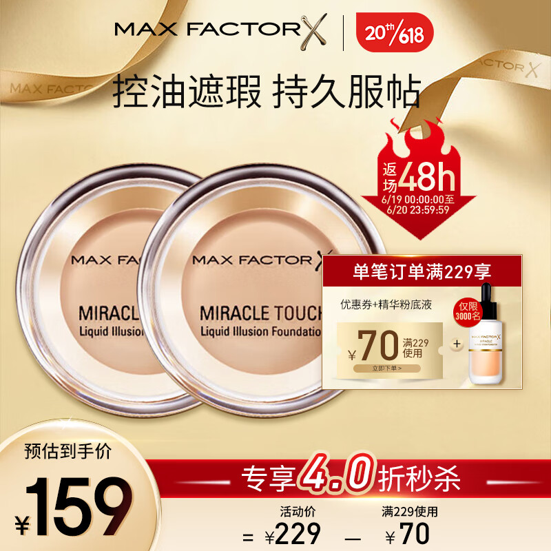 ¥159 蜜丝佛陀(MAXFACTOR)水漾触感粉底霜双支装裸妆粉底持久不脱妆45号暖杏色11.5g*2 229