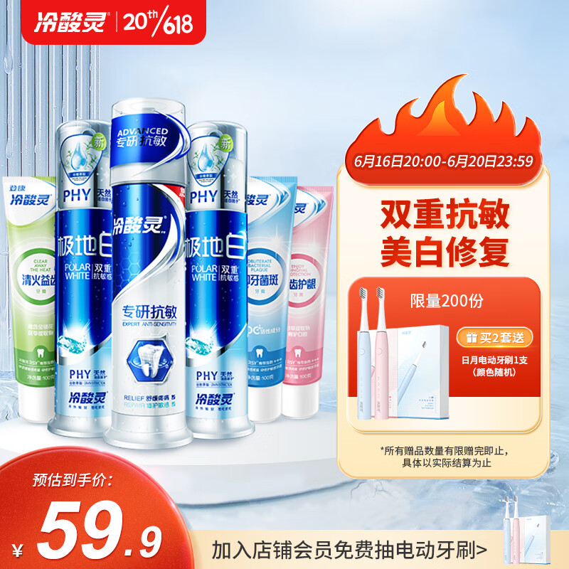 ¥54.9 冷酸灵双重抗敏感泵式牙膏全家福新套装(690g)+牙刷2支 美白牙齿 59.9
