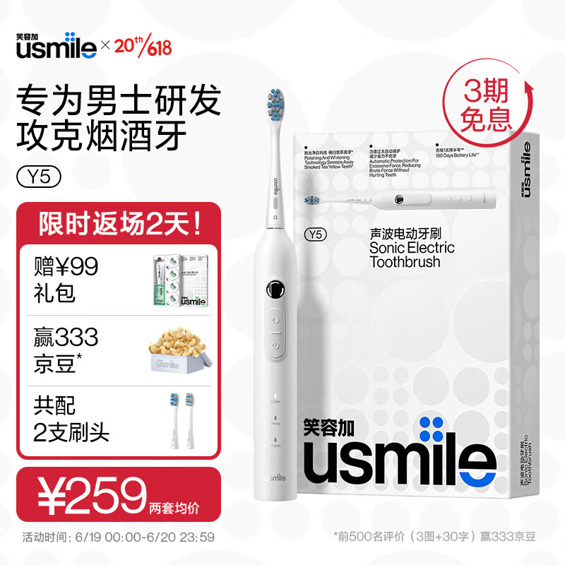 ¥319 usmile 笑容加电动牙刷 男士声波自动牙刷 情侣礼物 亮白能量刷送男友 Y5原力白 父亲节礼物 359