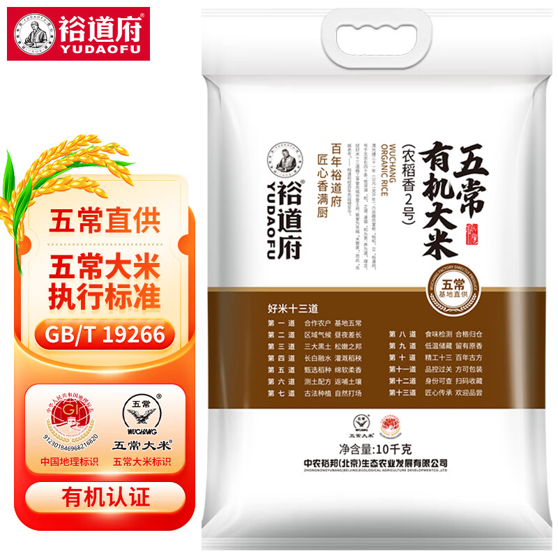 ¥131.1 裕道府 五常有机大米 农稻香2号 东北大米10kg 143