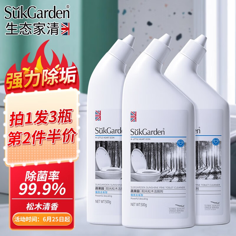 ¥29.9 蔬果园(SukGarden)马桶清洁剂洁厕液洁厕块洁厕灵蓝洁剂去污除菌去异味 松木香洁厕500g*3瓶 39.9