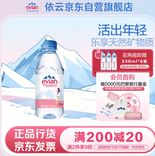 256元包邮!自营依云 矿泉水 含赠得330ml*54瓶