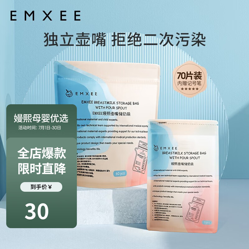 ¥26.9 嫚熙 一次性储奶袋母乳袋密封袋吸奶器电动手动存奶袋奶水人奶储存袋 双轨密封70片 200ml 29.9