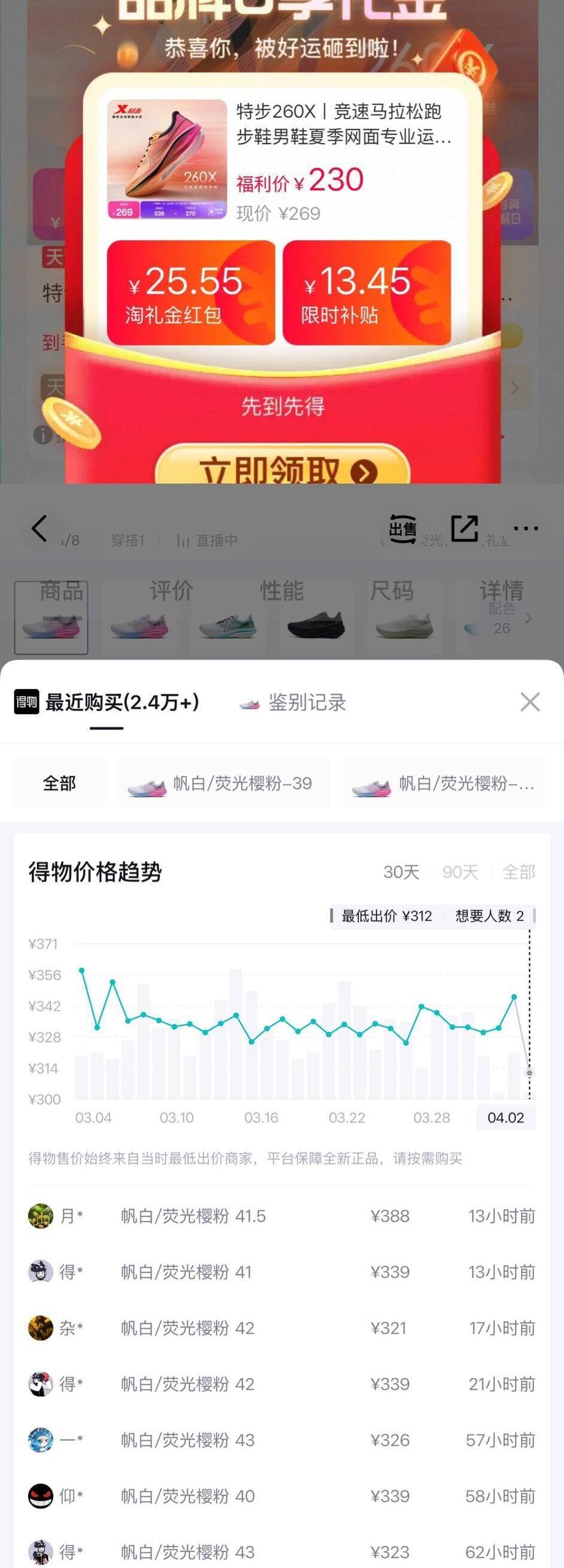 特步260x运动鞋领券到手仅需210元,得物价339元