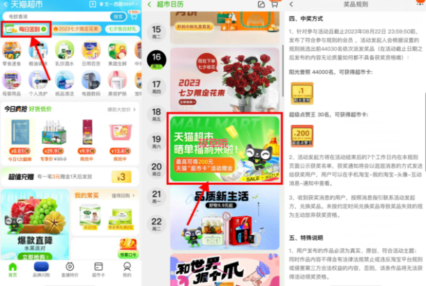 淘宝首页“天猫超市”->左上角“每日签到”->下拉点晒单的横幅进入->随便拍个5秒以上的视频,8月30日之前发放1元猫超卡,限量4.4万名