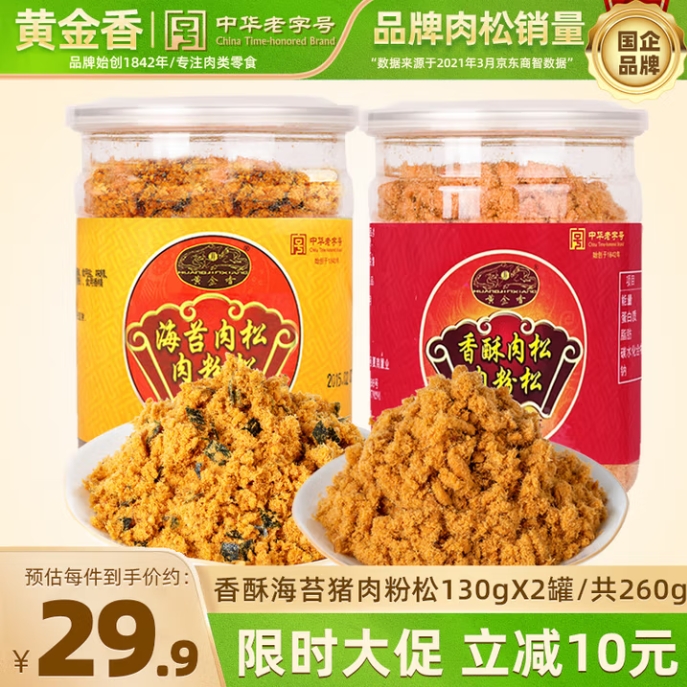 9.9元包邮!中华老字号 黄金香 厦门特产 猪肉粉松 海苔130g+香酥130g