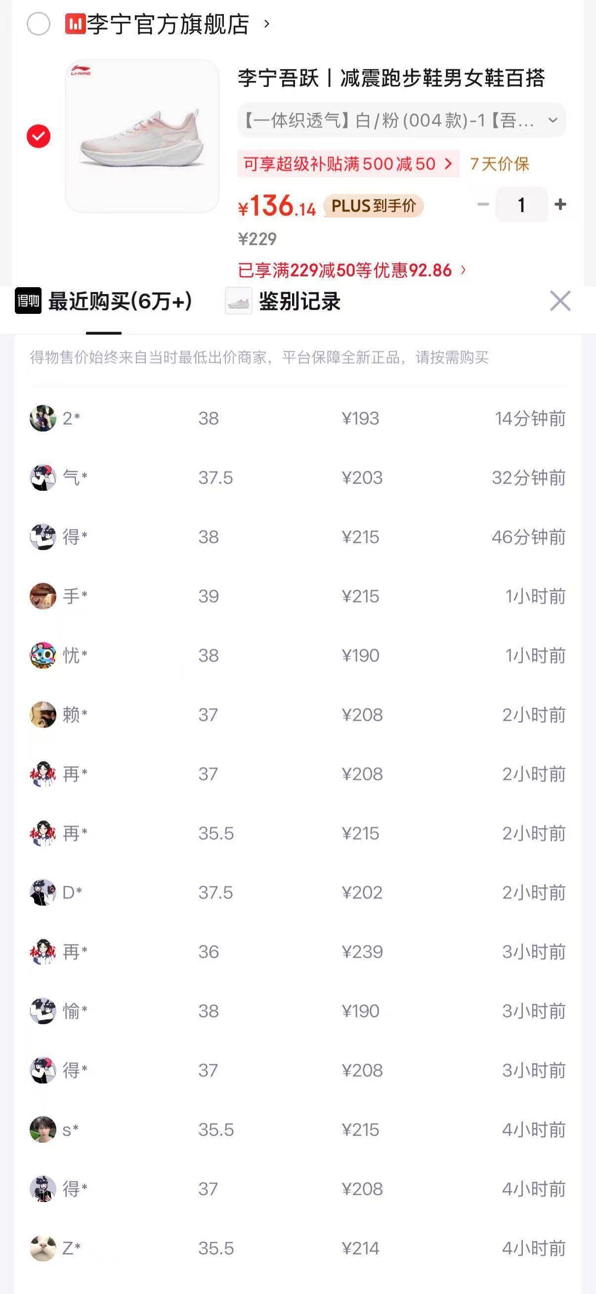 李宁吾跃跑鞋 PLUS 单拍仅需138元,比得物便宜71元