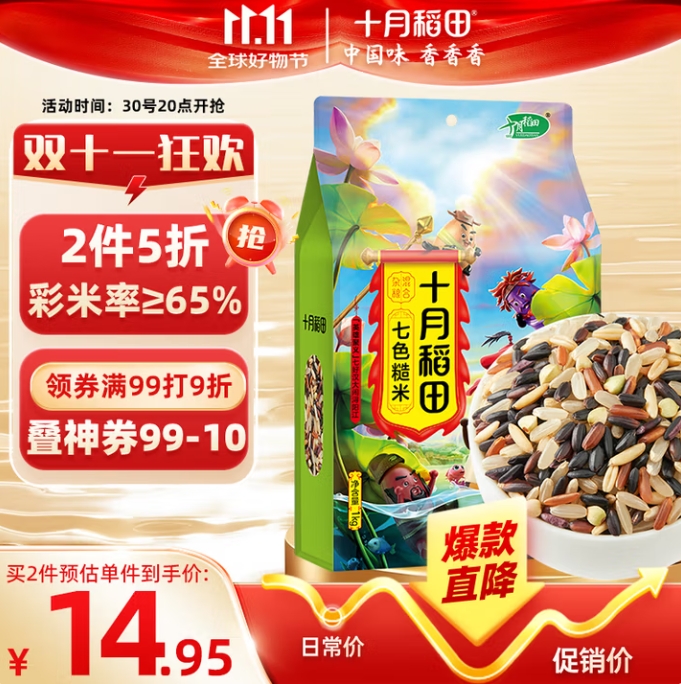 12.93元!十月稻田 七色糙米 1kg+血糯米 2斤 各拍2件