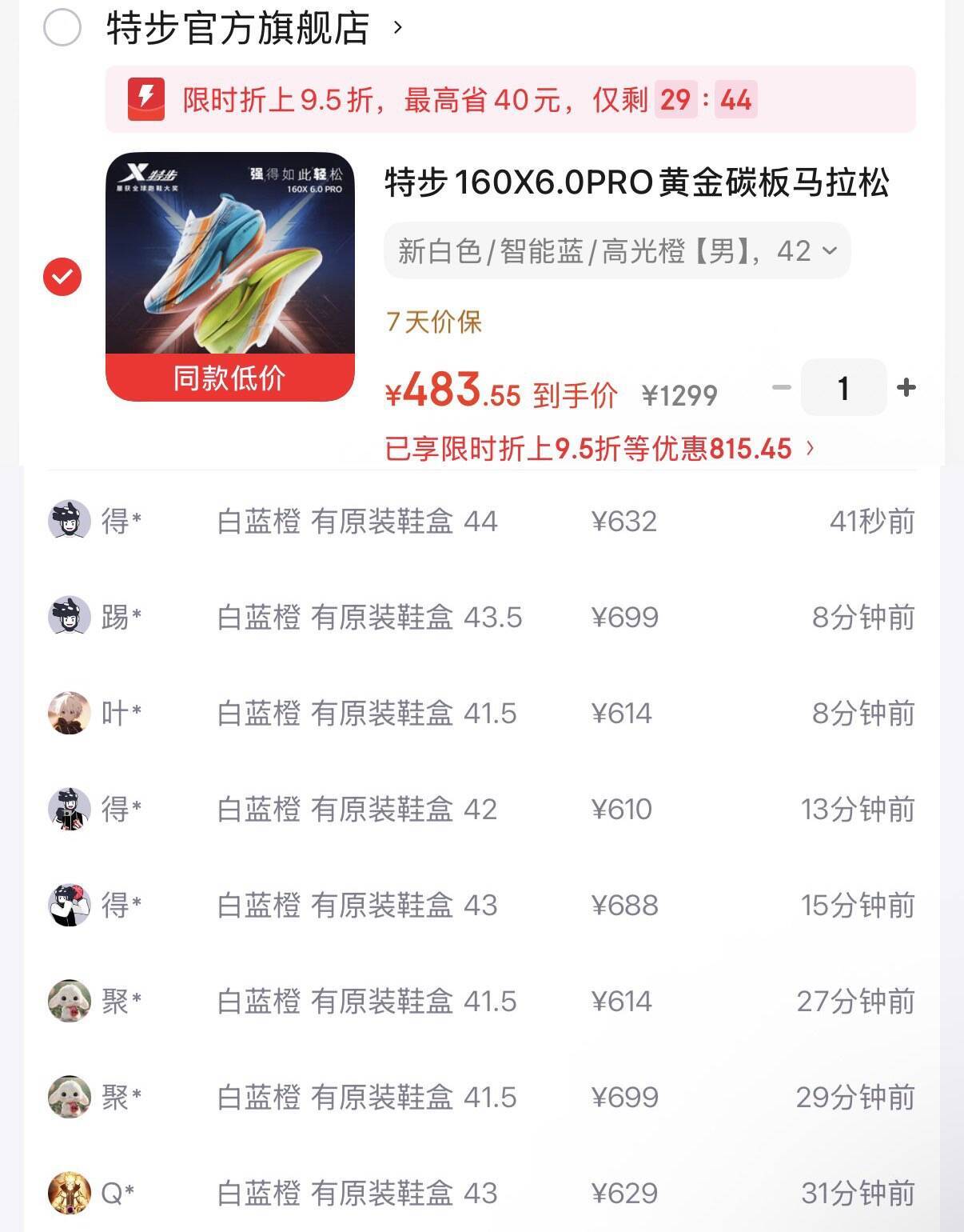 特步160X6.0 Pro跑鞋到手价444元,得物售价688元