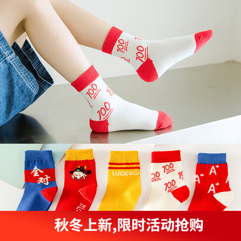 ¥24.9 卡拉美拉(Caramella)儿童袜子男童秋冬季棉袜亲肤透气中筒袜男孩小中大童满分红袜子 满分红袜5色5双装 M码16-18cm(建议4-6岁) 39.9