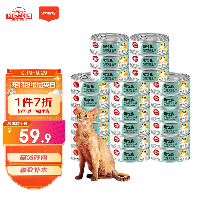 ¥89.9 顽皮(Wanpy)猫罐头湿粮猫咪补水添加苹果蓝莓零食80g 汤汁鸡肉鲣鱼口味24罐 99.9