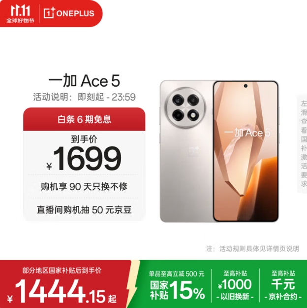 1439元包邮!一加 OnePlus Ace 5 5G手机 12GB+256GB 引力钛 第三代骁龙8