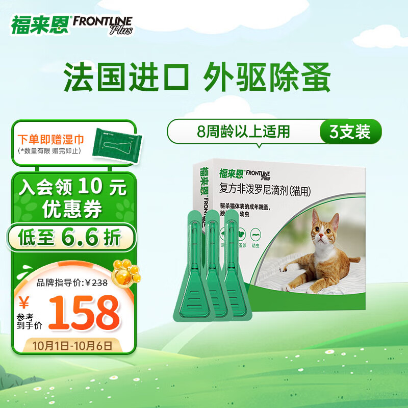 ¥200 福来恩(FRONTLINE) 猫体外驱虫滴剂 宠物猫咪去跳蚤蜱虫法国进口 整盒0.5ml*3支装 210