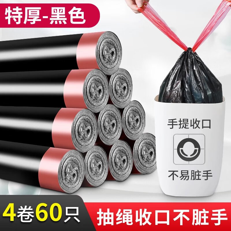 ¥13.2 加厚抽绳垃圾袋家用手提式黑色大号厨房自动收口清洁塑料袋装 大号【加厚自动收口】黑色60只 43.2
