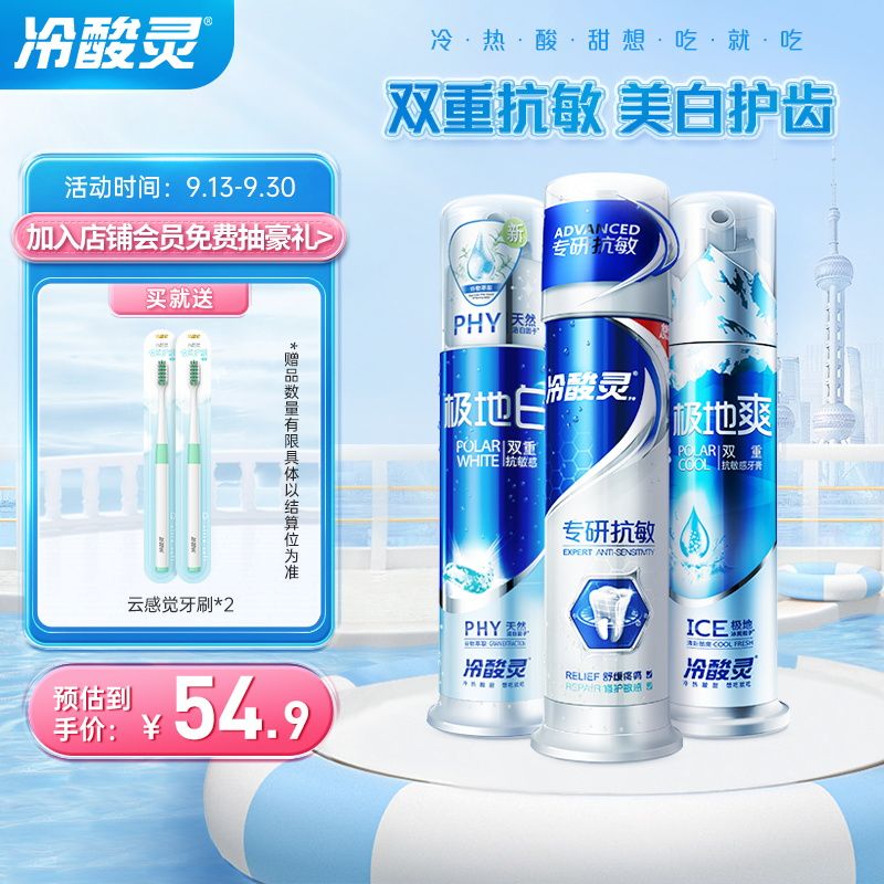 ¥39.9 冷酸灵双重抗敏感专研美白泵式牙膏三支装共390g 美白牙齿 清新口气 54.9