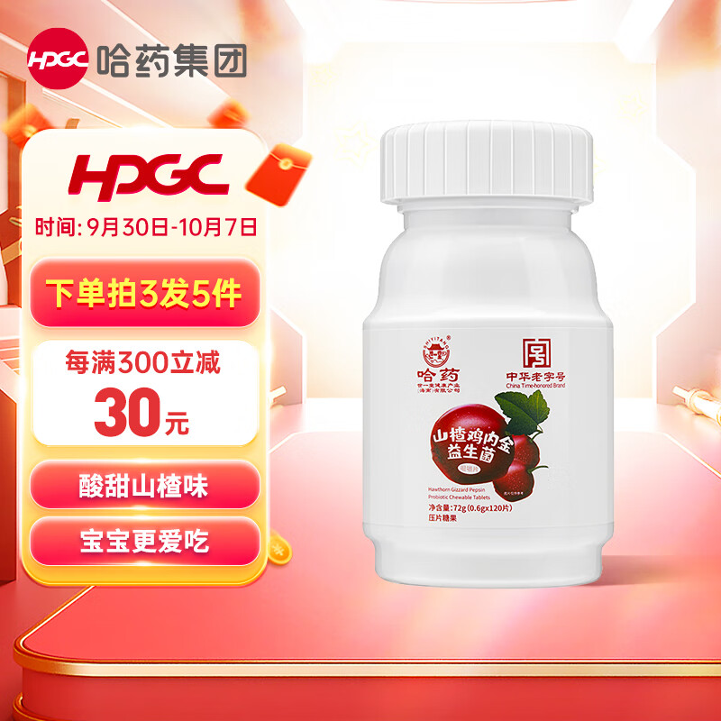 ¥24.9 哈药山楂鸡内金益生菌120片/瓶 积食肠胃消化酸甜零食山楂鸡内金咀嚼片72g 29.9
