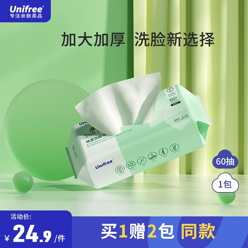 ¥24.9 unifree 珍珠纹一次性抽纸洗脸巾 加大加厚干湿两用 20*20CM 60抽单包 珍珠纹AB面3包装-180抽 29.9