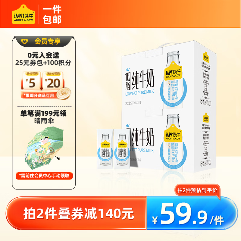 ¥119.9 认养一头牛低脂牛奶200ml营养早餐健康休闲整箱原味送礼礼盒团购 整箱装 200ml*10盒*2提 129.9