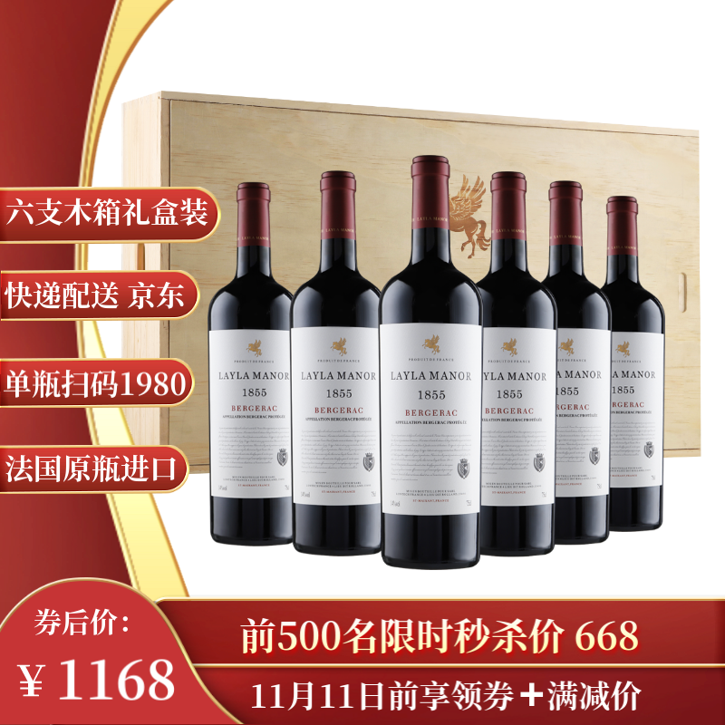 ¥1068 蕾拉法国进口AOP级14度干红葡萄酒法国LAYLA MANOR 木箱礼盒750mlX6瓶 1568