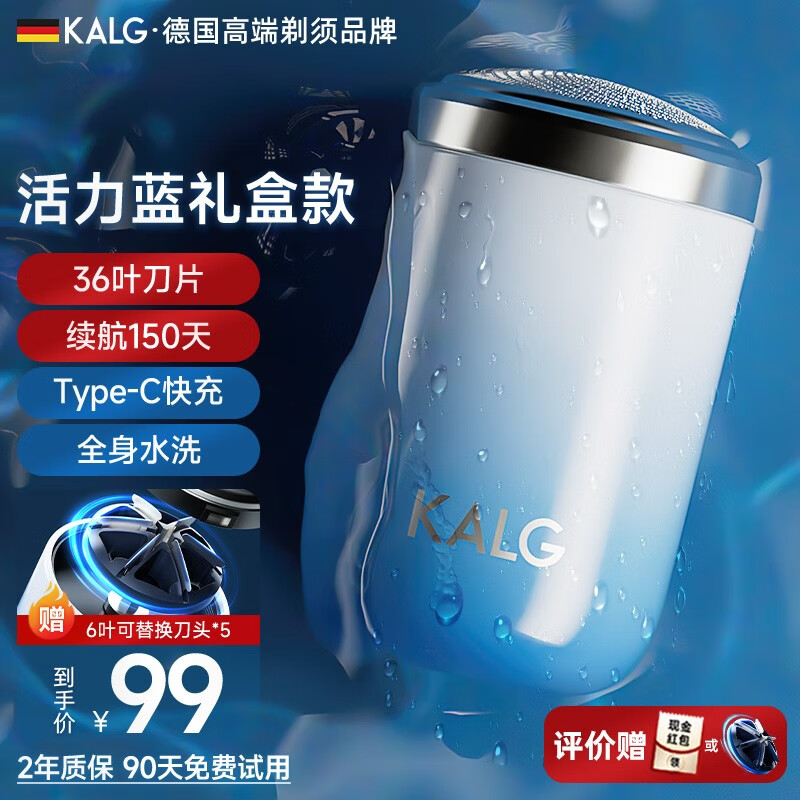 ¥59 KALG剃须刀电动小钢炮男士迷你便携刮胡刀全身水洗胡须刀送男友送父亲生日礼物 活力蓝礼盒款:36叶刀片+150天续航 99