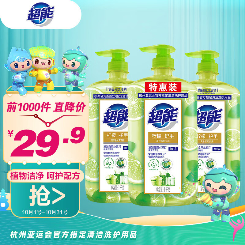 ¥23.9 超能 离子去油洗洁精柠檬护手1kg*3套装 29.9