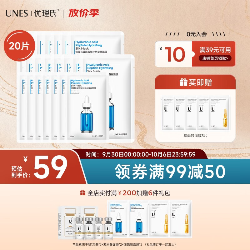 ¥29 优理氏(UNES) 4D玻尿酸蚕丝面膜密集补水深层清洁滋润熬夜提亮肤色平衡保湿 【20片】4D玻尿酸面膜 109