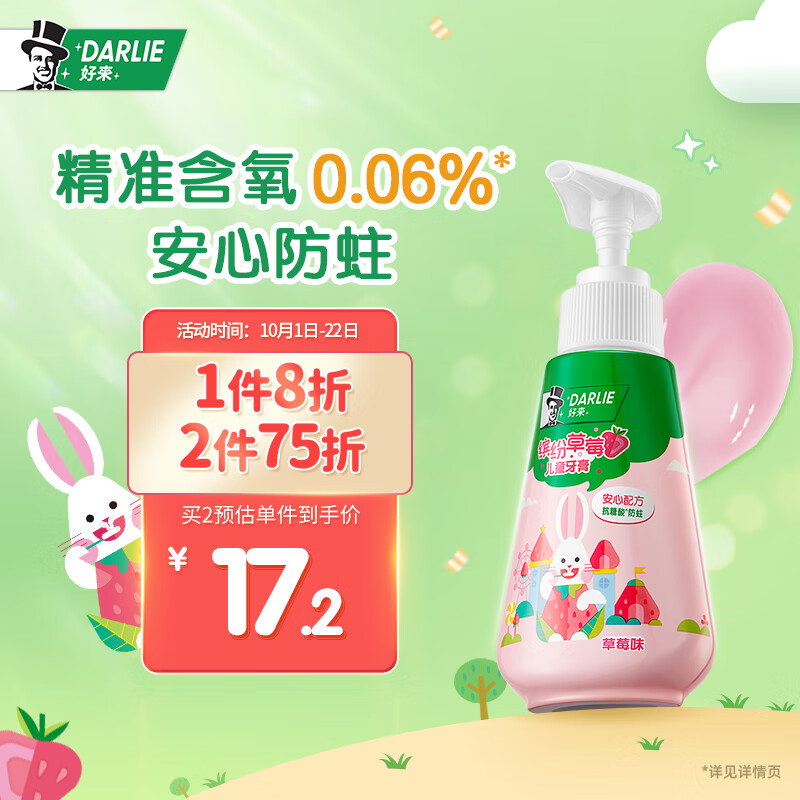 ¥15.9 DARLIE 好来(原黑人)按压式儿童牙膏3-6-12岁 草莓味120g抗糖酸防蛀含氟 22.9
