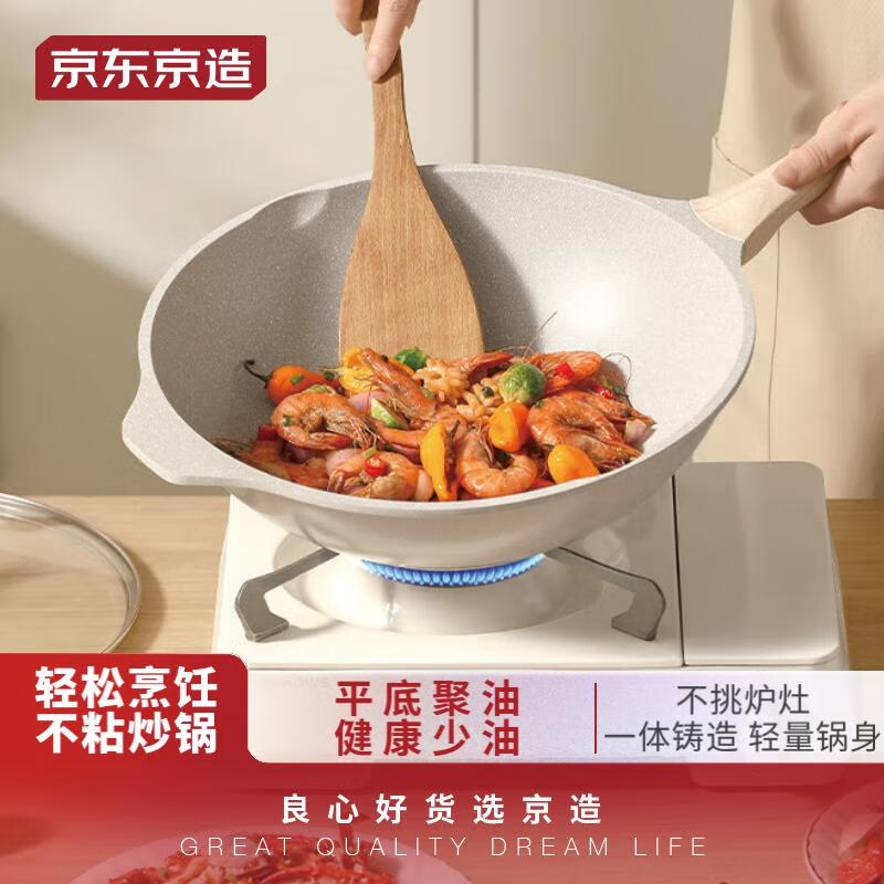 ¥99 京东京造 炒锅 白色麦饭石色不粘锅少油烟炒菜锅平底炒锅 电磁炉通用 32cm 109