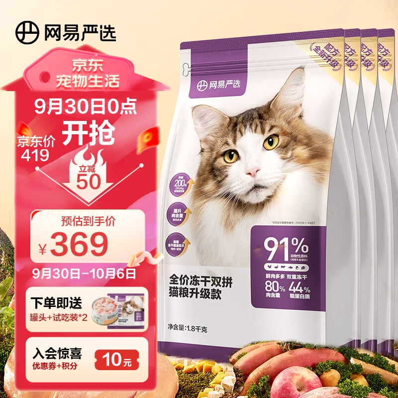 ¥389 网易严选 全价冻干双拼猫粮宠物主粮幼猫成猫全价天然无谷粮猫咪食品7.2kg 399